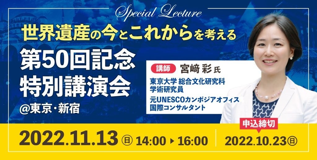 NPO法人 世界遺産アカデミー(所在地:東京都千代田区)は、世界遺産検定が第50回の節目を迎えることを記念し、11月13日(日)に特別講演会を東京・新宿で開催します。当日は、元UNESCOの職員である宮﨑 彩氏による講演のほか、世界遺産に関する有識者をお招きし、パネルディスカッションを実施します。