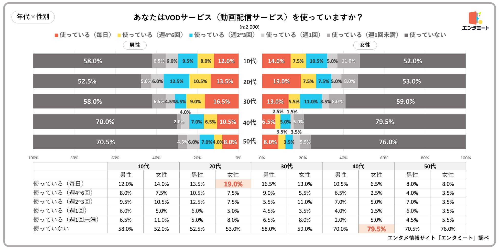VODサービスの利用頻度が高いのは、上記のように主に10代~30代という結果になりました。