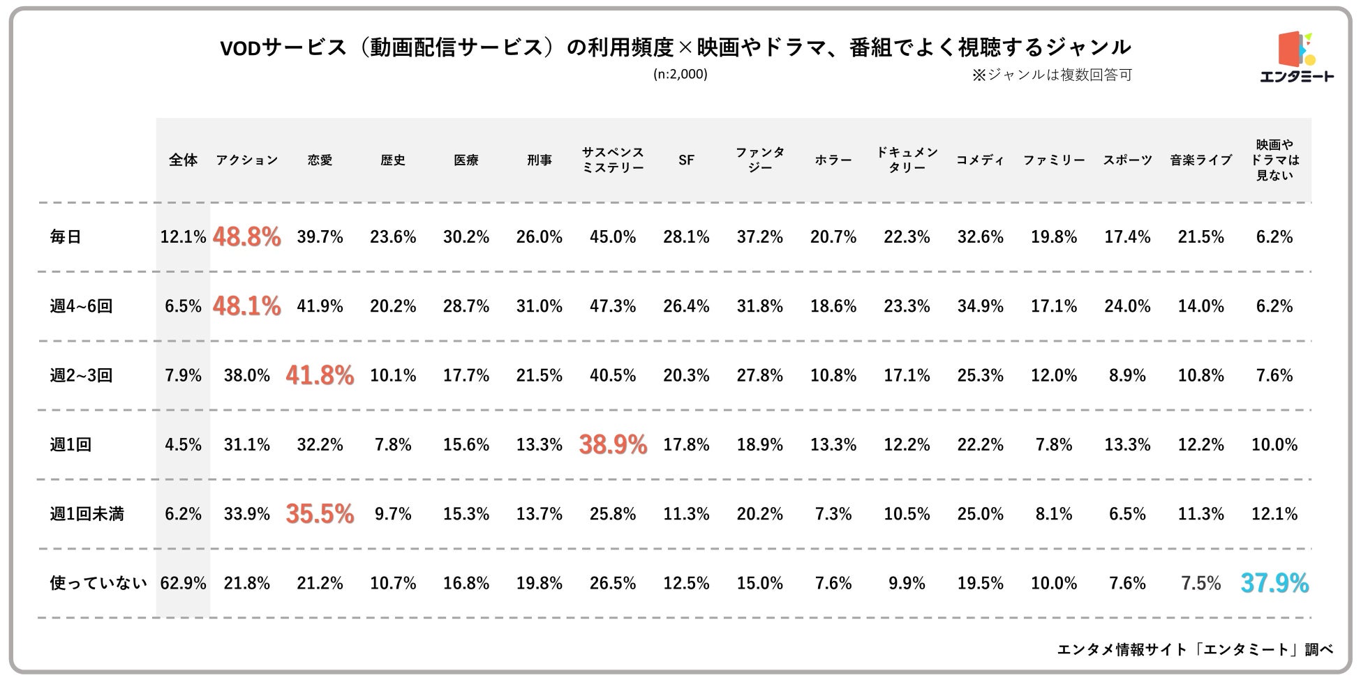 VODサービスの利用率と、映画・ドラマ・番組でよく視聴するジャンルの掛け合わせで見ると、「毎日使っている」人で回答率が最も高かったジャンルは「アクション」で48.8%となりました。