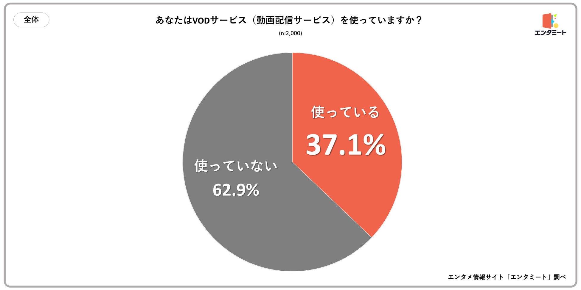 全国の10代~50代の2,000人の男女を対象とした「あなたはVODサービス(動画配信サービス)を使っていますか?」というアンケートを行ったところ、「使っている」という人は37.1%となりました。