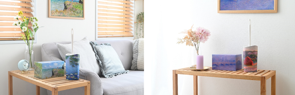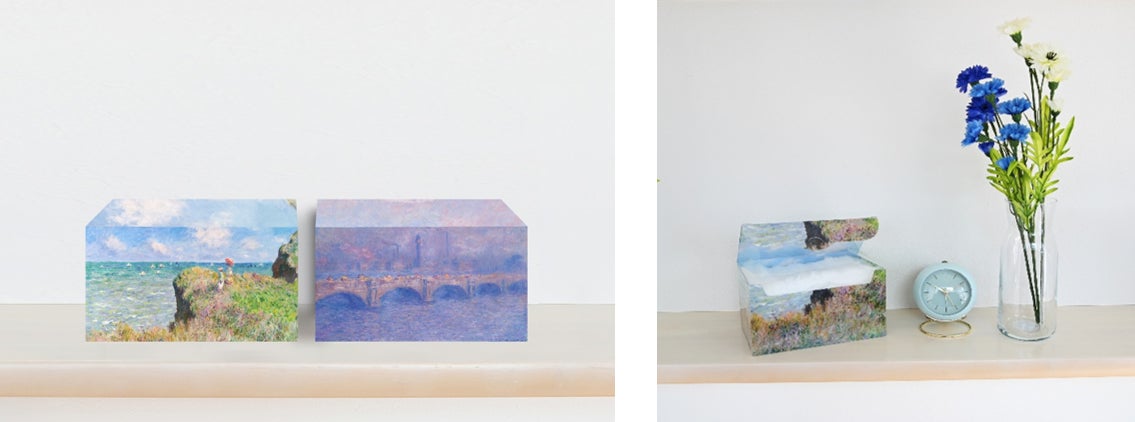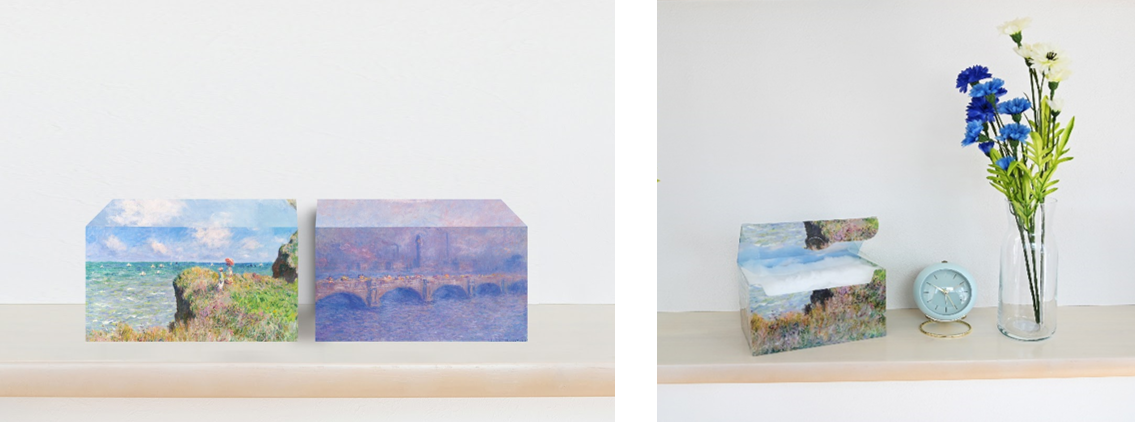 ・取り替えシートのボックスにモネの「プールヴィルの断崖の上の散歩」と「ウォータールー橋、太陽の効果」を採用したデザインを用意しました。