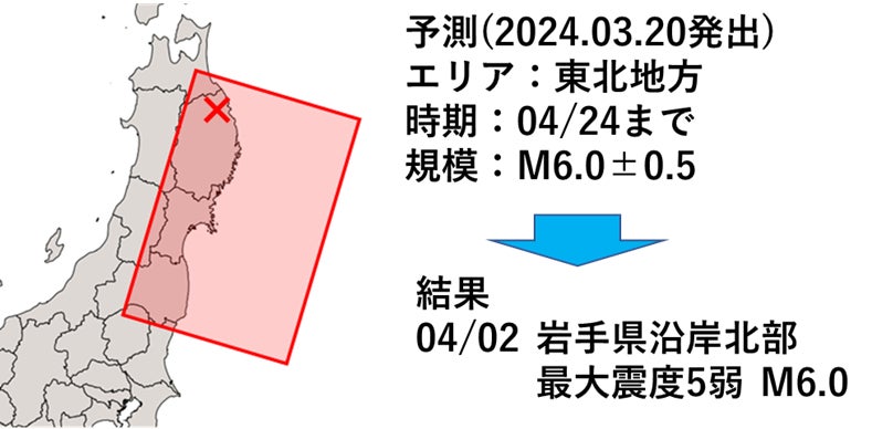 結果として、2024年4月2日に岩手県沿岸北部を震源とする最大震度5弱、マグニチュード6.0の地震が発生しました。JESEAの予測と実際の地震は、場所・時期・規模ともに合致する結果となりました。