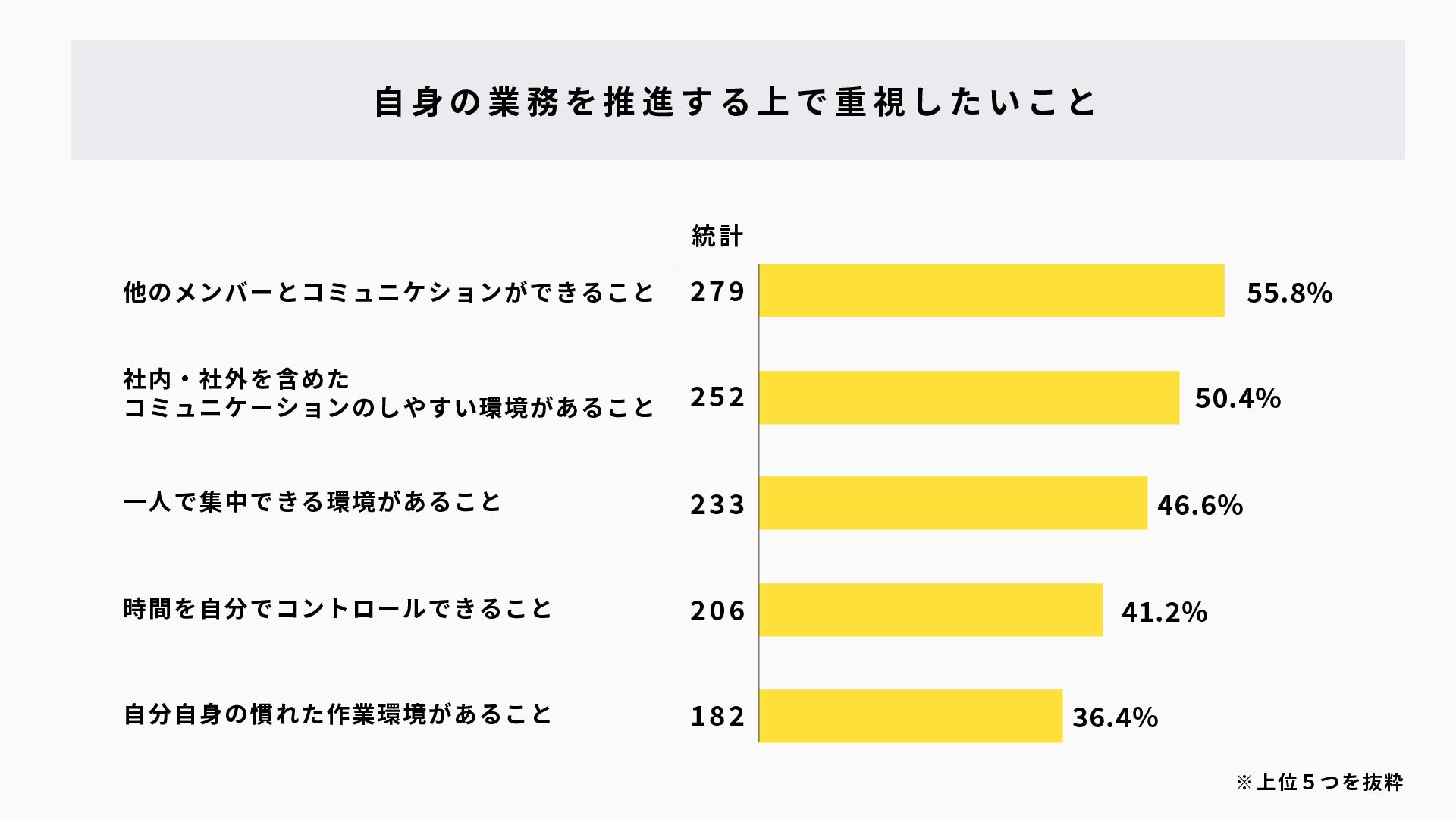 ・ハイブリッドワーク者の55%が、自分の業務推進のためには他メンバーとのコミュニケーションが重要と回答