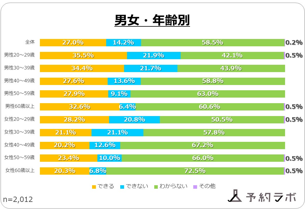 利用している金融機関で来店予約ができると認識している人は全体の27%でした。全体の58.8%が可能か否かわからないと回答しています。その58.5%の年齢別内訳を見ると、男女の差はあるものの、高齢になるほどその率は増加している傾向がありました。