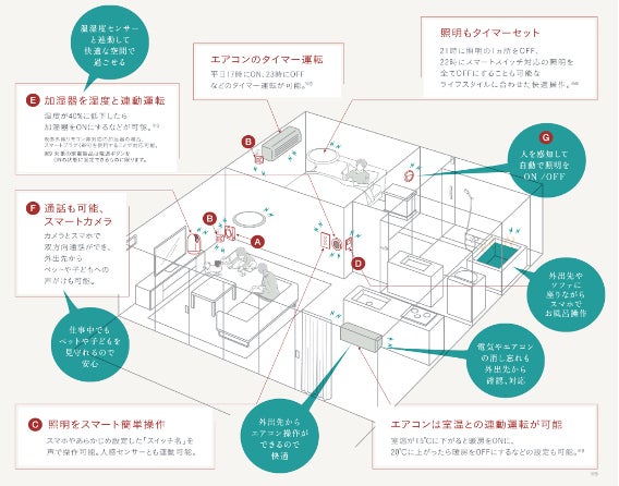 本物件では、HomeLinkアプリを通じてスマートフォンでの家電操作に加え、GPS連動で最寄駅に近づくとエアコンなどが自動稼働する快適空間の実現や、夜間休日の急な体調不良時に医師が自宅で診察する救急往診やオンライン診療などを手配する医療サービス「ファストドクター」への相談もシームレスに行えるよう整備しました。