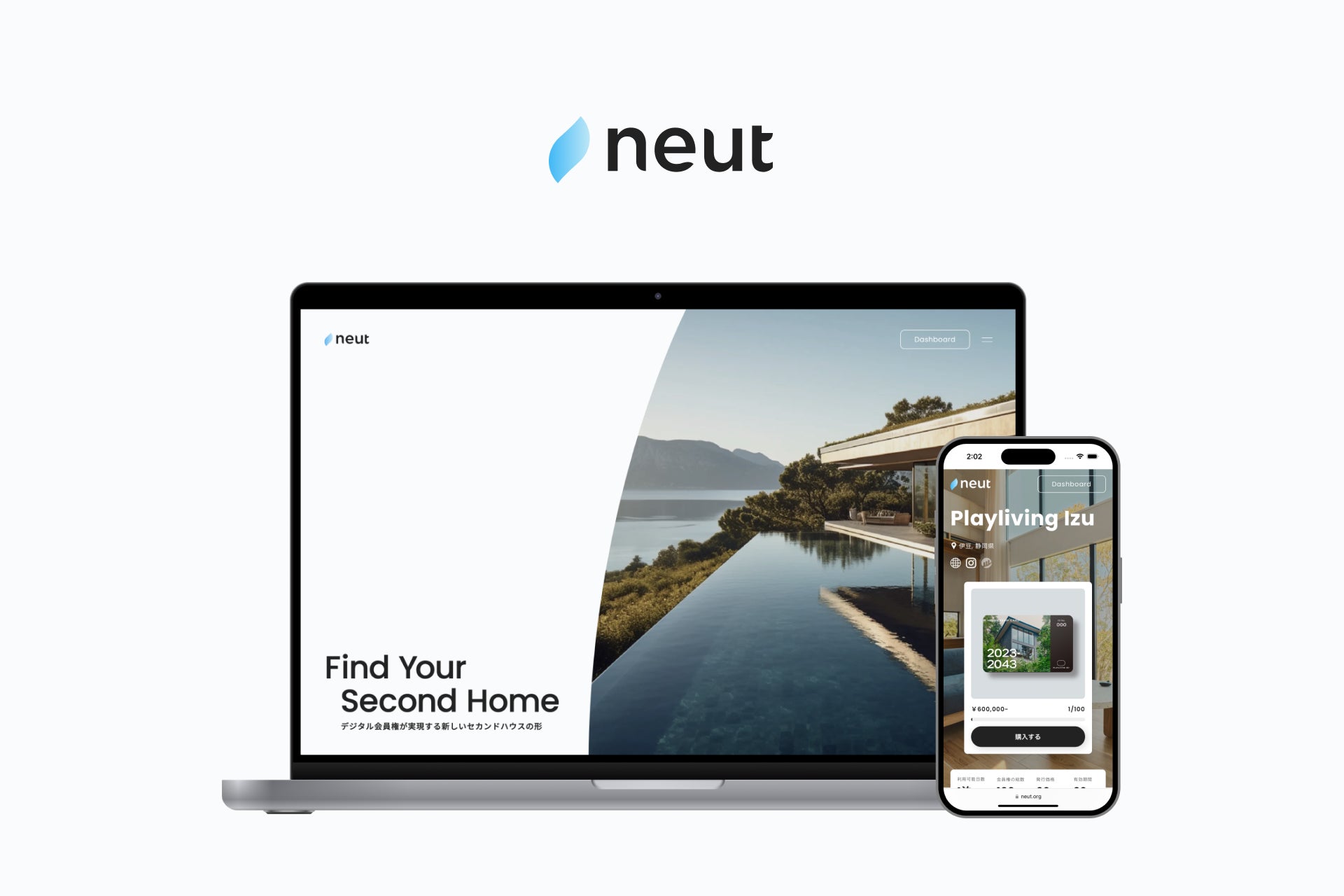 Neut(ニュート)とは、ホテルやヴィラなどの宿泊施設のデジタル会員権を探し、購入することができるプラットフォームです。デジタル会員権を持つことによって、セカンドハウスがある暮らしをより気軽に実現できます。