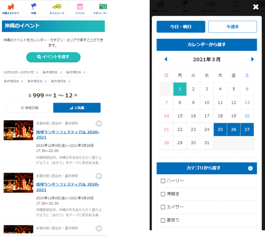 イベントのジャンルや開催エリア、市区町村のデータ項目も連携しますので、「おきなわ物語」上でそれらの項目での検索が可能となります。