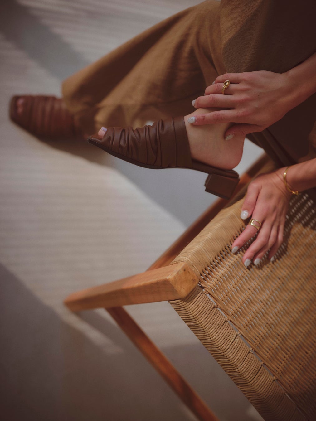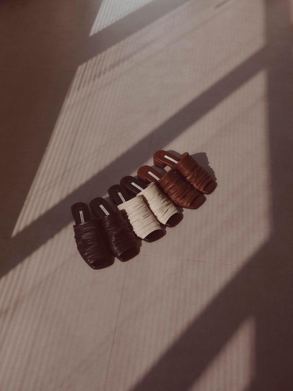 上質な柔らかいレザーをたっぷりと使用し、ギャザーを寄せたデザインは主張しながらもどんなコーディネートにも合わせやすいデザインで足元に抜け感をプラスしてくれます。内側にはクッションを入れて足を包み込む気持ちの良い履き心地に仕上げました。