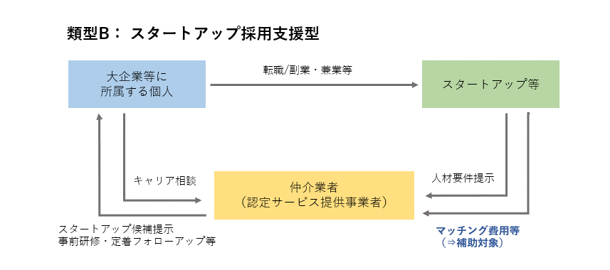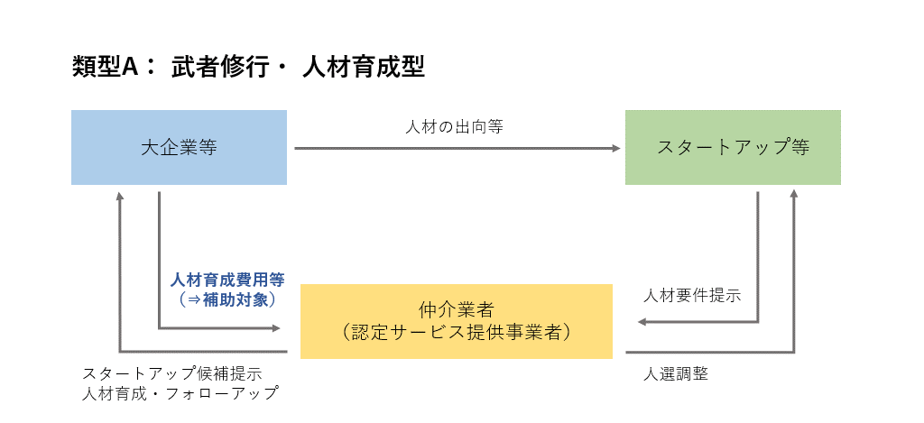 支援概要:大企業等が、若手・中堅人材の育成を目的とし、認定サービスを活用してスタートアップ等に人材を送り込む取り組み。人材を送り出す大企業等が、認定サービスに対して費用を支払うものを想定。