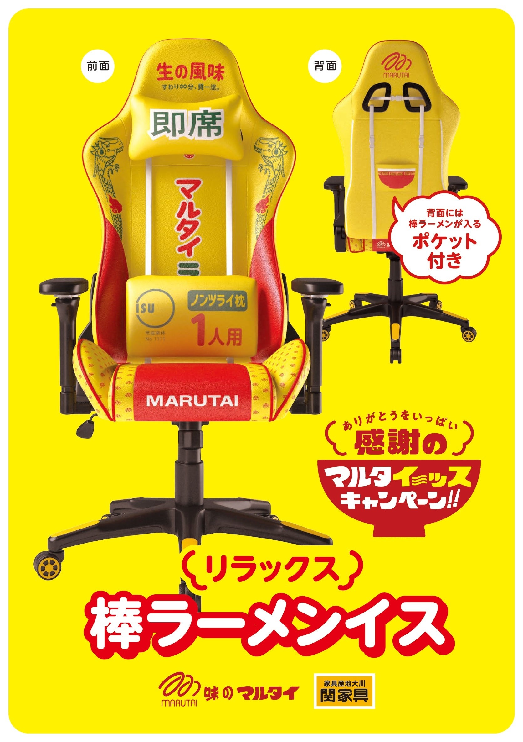 マルタイ特製ゲーミングチェア「棒ラーメンイス」などが当たる、「感謝のマルタイーッスキャンペーン」開催!