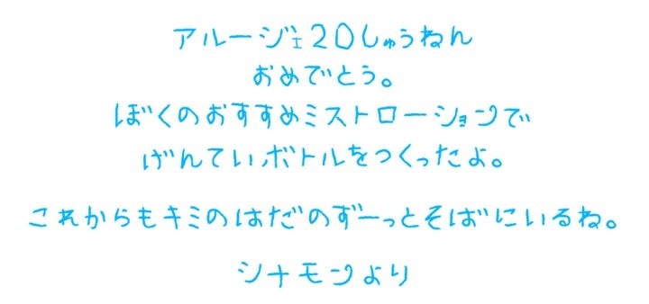 コラボデザインボトルではアルージェを抱えた可愛らしいシナモンのデザインを特別に描き下ろしていただきました。