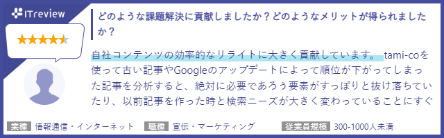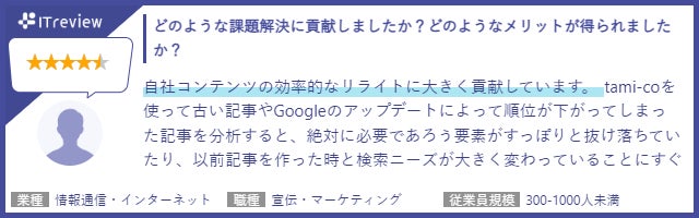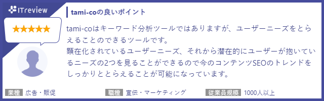 「tami-co」は高い顧客満足度(5点満点中4.4点)を獲得し、利用者からは以下のようなコメントが投稿されています。