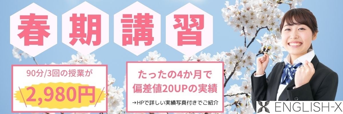 東京大学や早稲田大学・慶應大学の現役合格など多くの実績を持つENGLISH‐Xの授業を春期講習(2024年3月1日(金)~2024年4月2日(火))期間、全3回2,980円(税込)でご提供いたします。