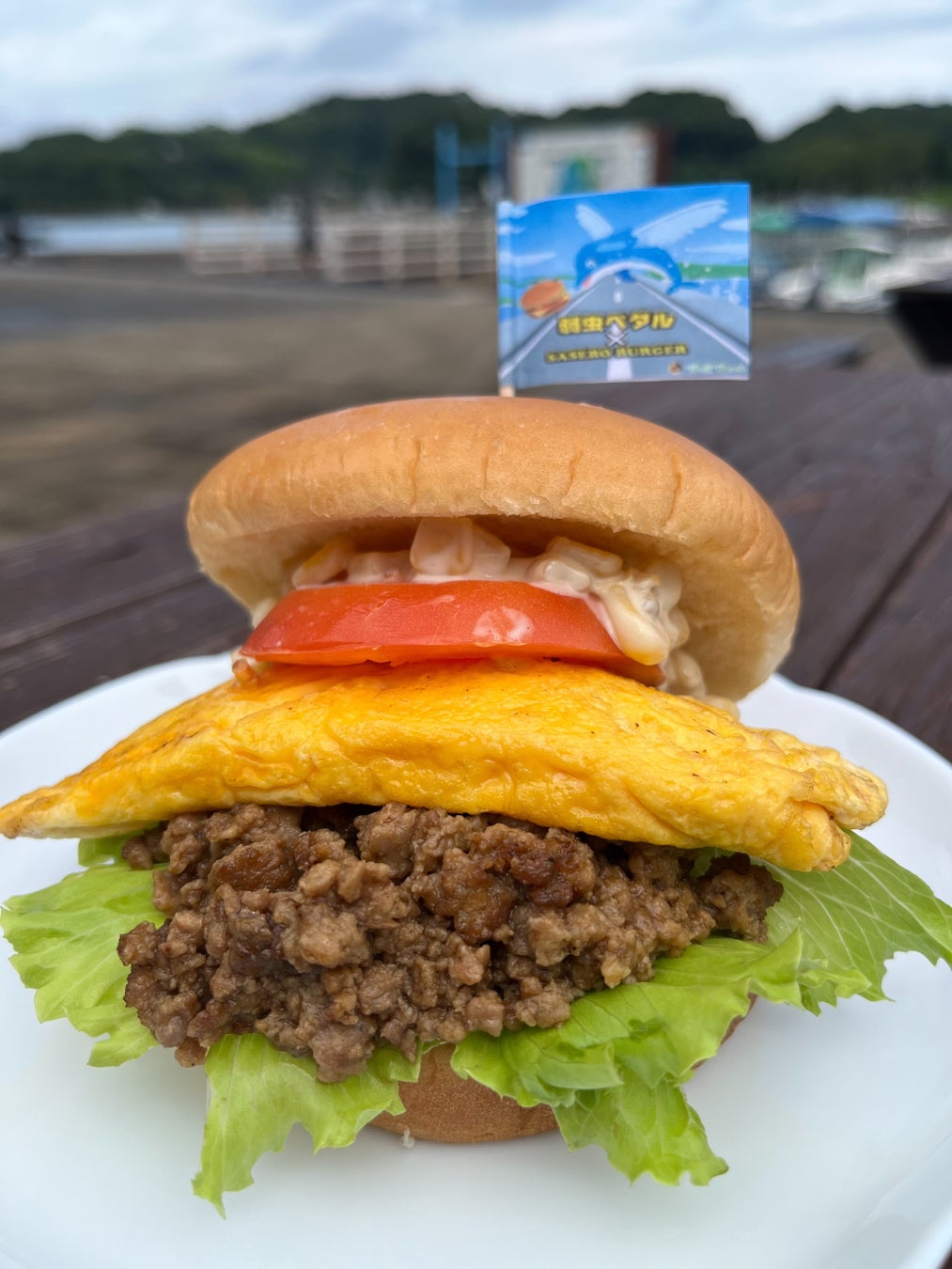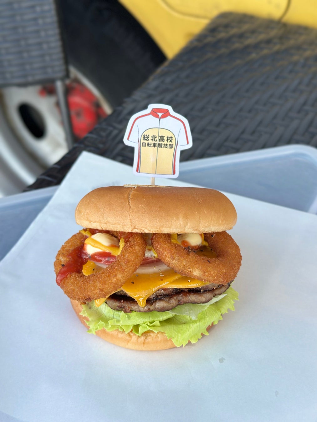 佐世保バーガーC&Bこだわりの国産牛肉・豚肉100%の手ごねパティを2枚。総北カラーの黄色をイメージし、チェダーチーズ2枚。自転車の車輪と主人公の小野田坂道のメガネをイメージしオニオンリングを2つトッピング。差し色の赤をケチャップで表現し、自作の弱虫ペダルユニフォームのピックを差しました。