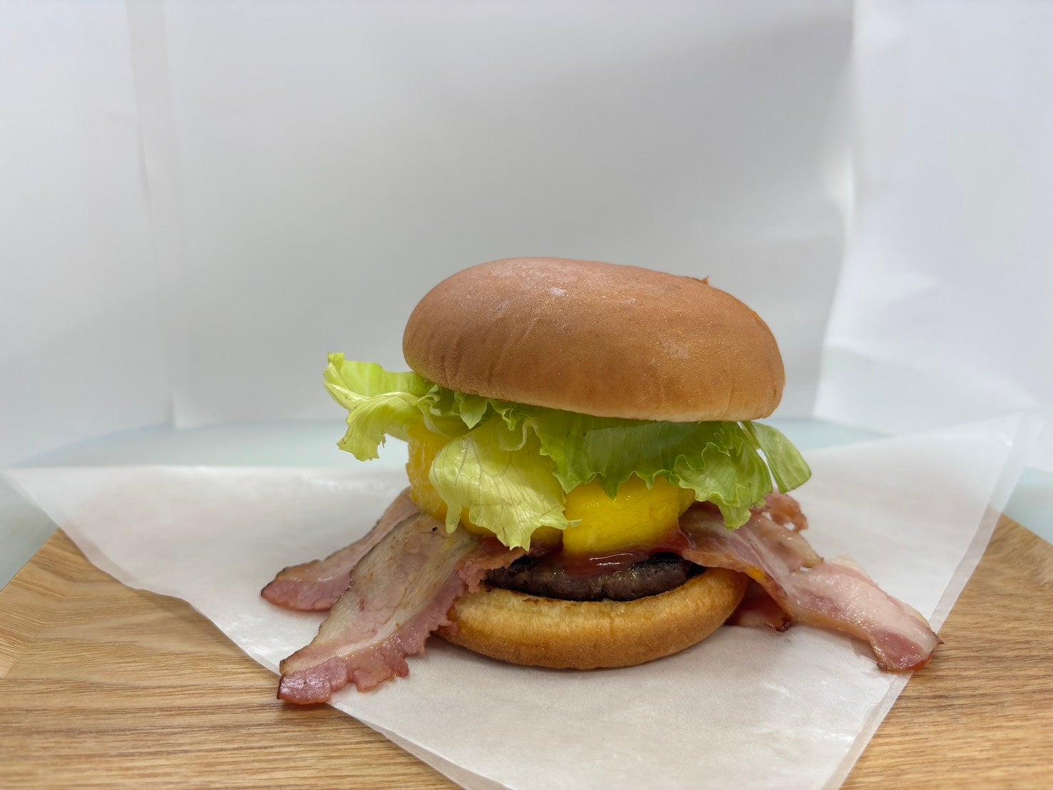 イエローにちなんでリッチに使った佐世保産マンゴーと自家製ベーコンが織りなす、甘じょっぱいハーモニーがクセになるバーガーです。