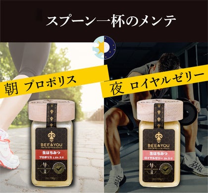 エナジー生はちみつ、1スプーン(朝プロポリス、夜ロイヤルゼリー)で皆様の元気な日々を応援致します。