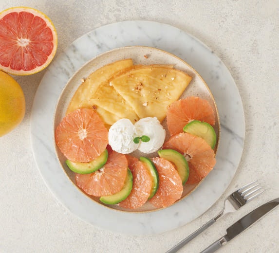 バターが香るもちもちのクレープ生地に、ジューシーなフロリダグレープフルーツがたっぷり!まろやかな甘さのルビーとクリームチーズのような味わいのグリークヨーグルト、そしてクリーミーなアボカドが口の中に広がります。さらに、クレープの上に乗ったカリッとしたアーモンド&カシューナッツが、アクセントに。さっぱりとしたアカシアハニーと一緒にお楽しみください。