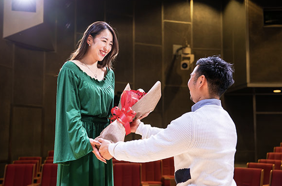 彼女を舞台上へエスコートし、おふたりだけの空間で人目を気にせずに思いっきり愛の言葉を。バラの花束や婚約指輪などのプレゼントや、心のこもった手紙をお渡しすると、さらに感動的なサプライズに。