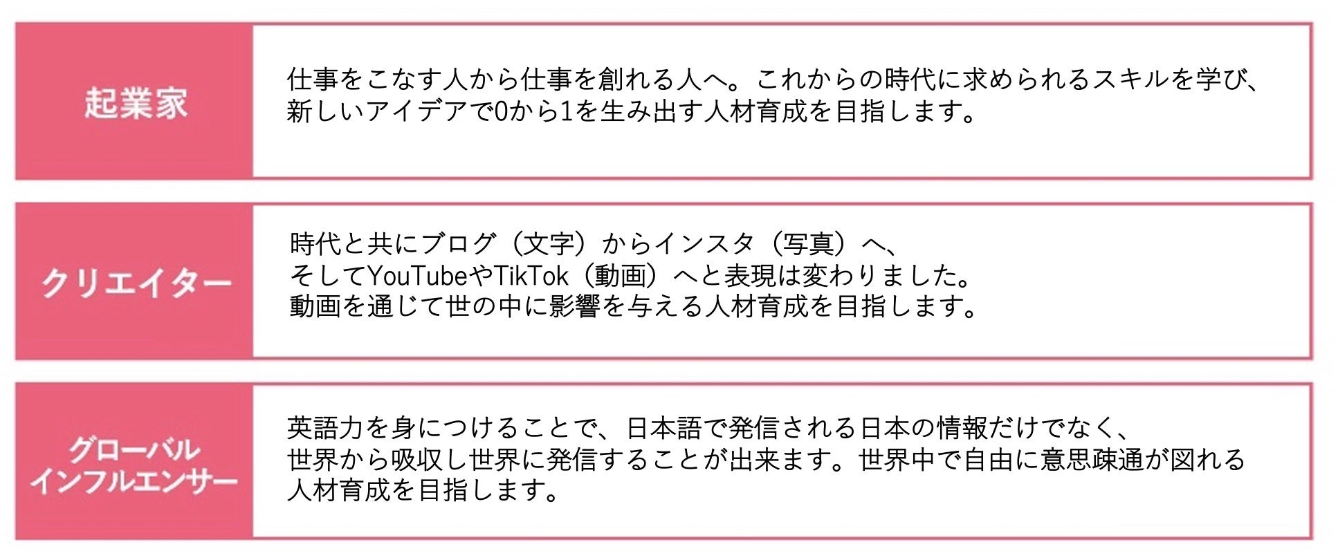 コース: グローバルインフルエンサーコース/クリエイターコース/起業家コース/進学コース