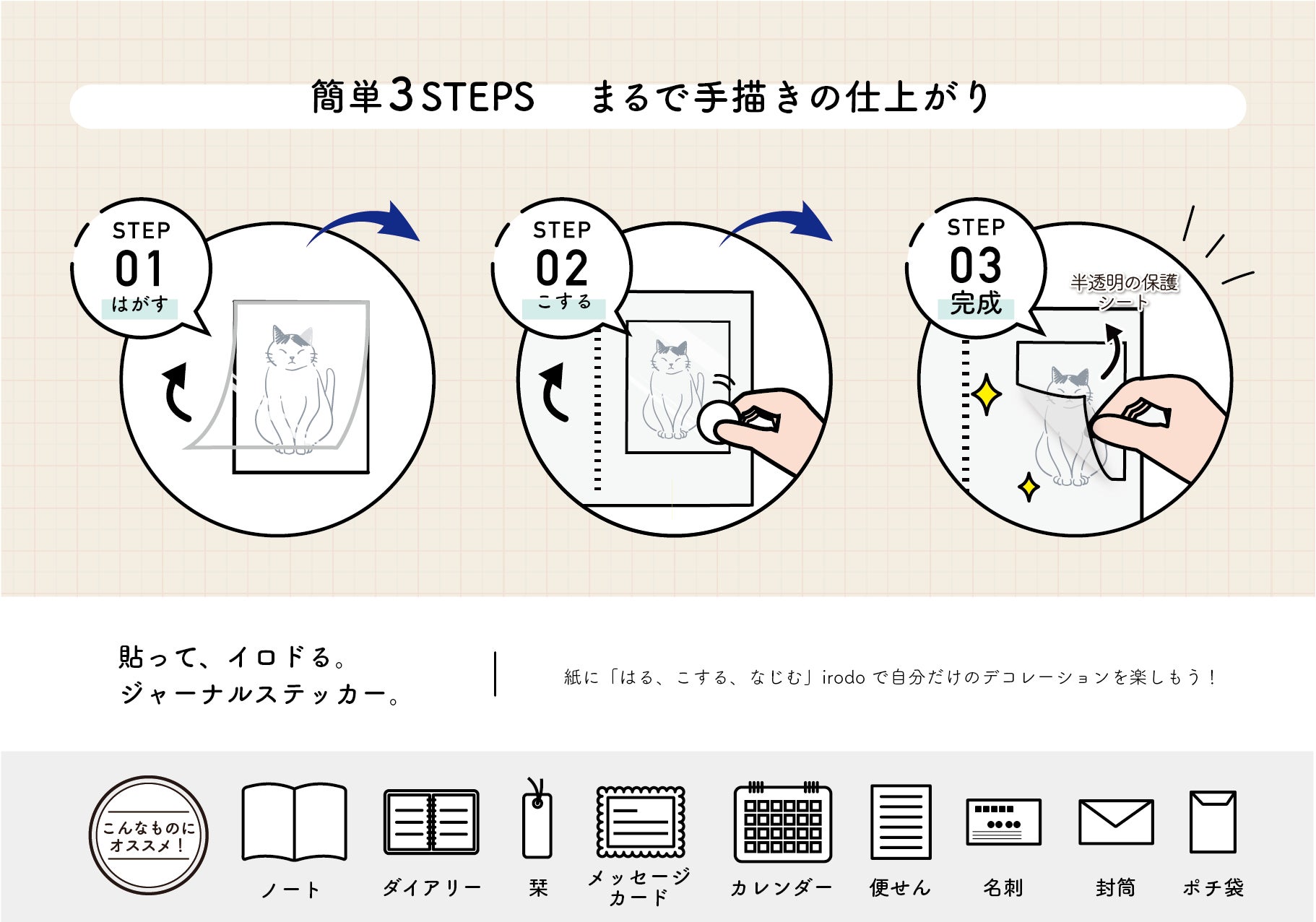 まるで元々印刷してあったような仕上がり。紙専用転写シール“irodo”JOURNAL STICKER