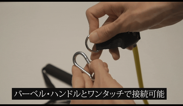 好みのチューブ(強度設定)を選んだら、付属のカラビナにワンタッチで取り付けるだけでトレーニングが開始出来ます。