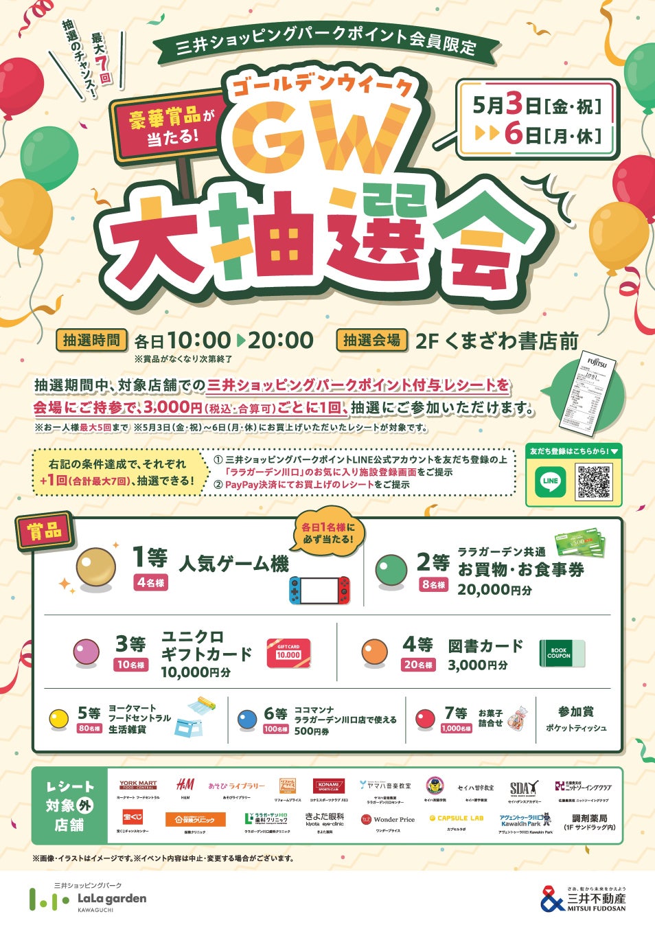 ■実施概要:抽選期間中、対象店舗での三井ショッピングパークポイント付与レシートを会場に持参で、
