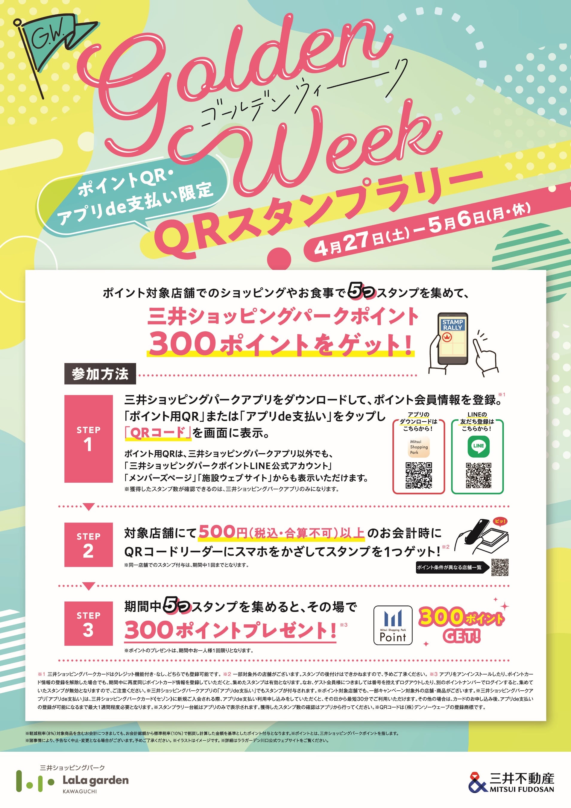 ■実施概要:三井ショッピングパークカード《セゾン》・アプリde支払いでのお支払いで100円(税別)につき5ポイント。 クレジット機能なしポイントカード・ポイント用QRは100円(税別)につき4ポイント。