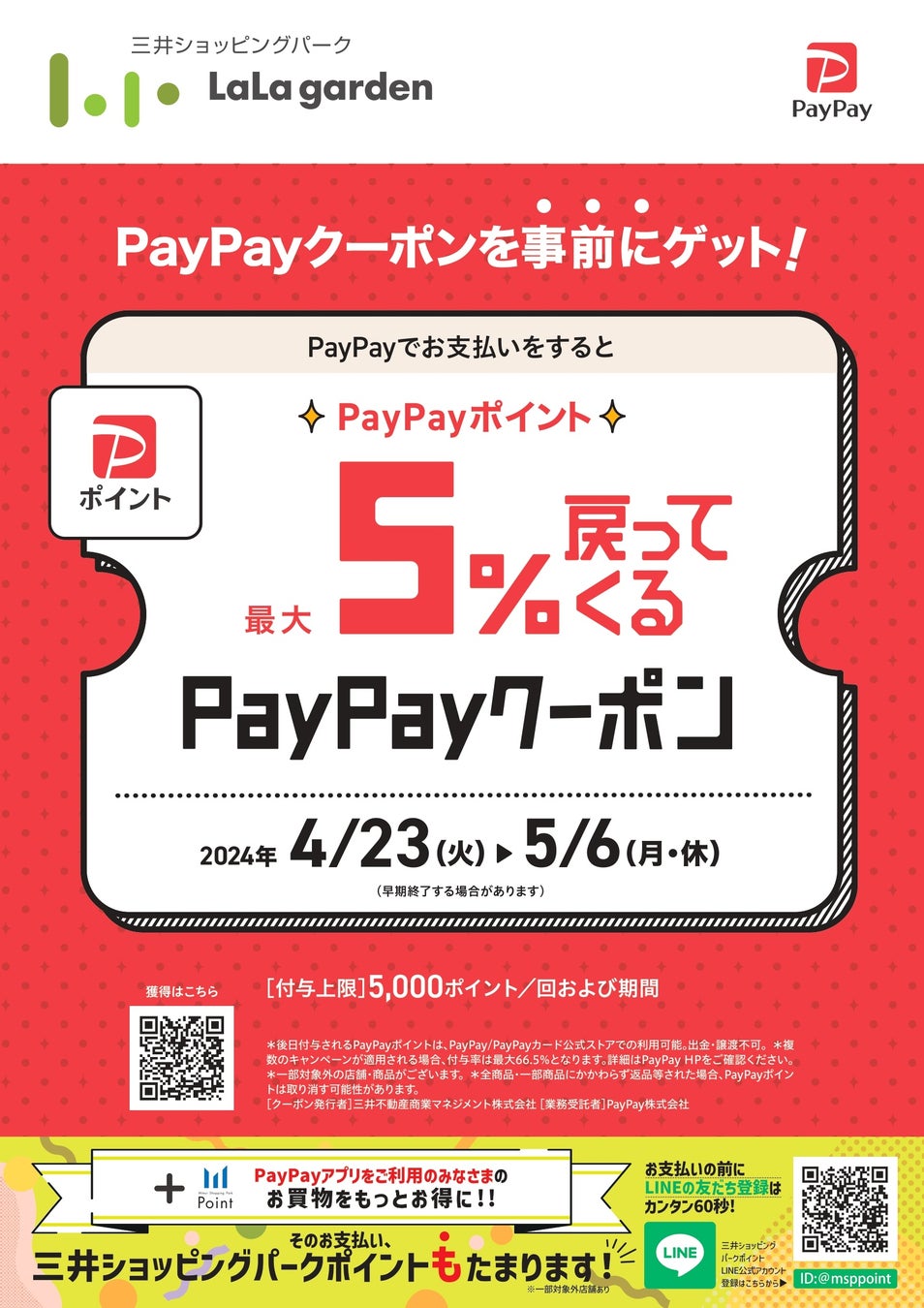 期間中、家族みんなで楽しめる大人気の『恐竜ランド』の他、『最大5%戻ってくるPayPayクーポン』、人気ゲーム機やララガーデン共通お買物・お食事券などが当たる『GW大抽選会』やユニクロ、GU、ニトリ デコホーム、アカチャンホンポ限定の『ポイントアップデー』などで地域のみなさまへ大還元!
