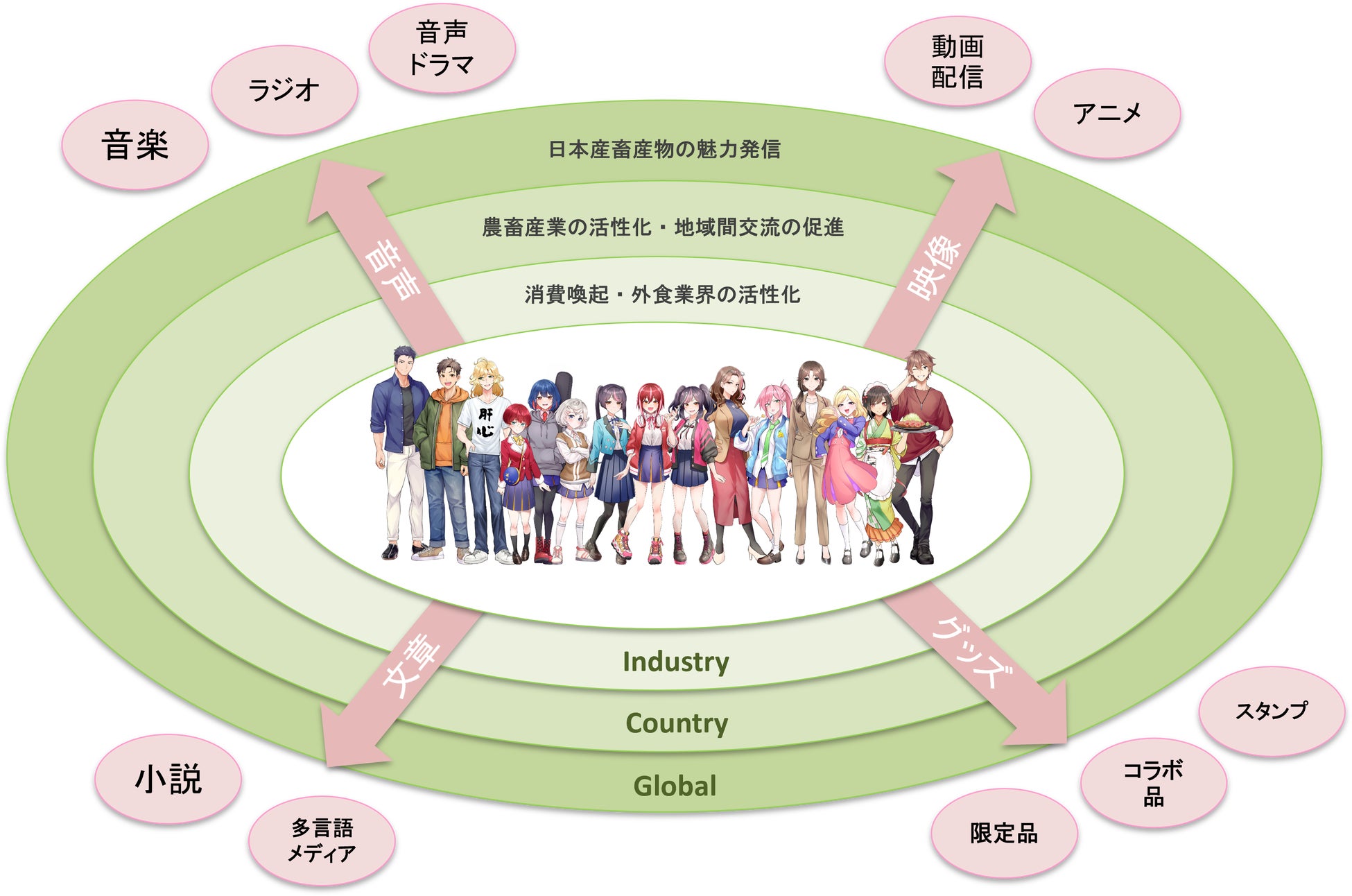 ⾁をモチーフとする多彩なキャラクター達が織り成す「物語」を通じ、⽣産者の努⼒やこだわり、そこから⽣み出される魅⼒ある畜産品にスポットを当てることを⽬的にスタートしました。⽇本各地の畜産品やその特⾊ある⾷べ⽅などを紹介することで、消費者や、⾷を取り巻く様々な企業がつながる「きっかけ」を創出することを⽬指して活動を⾏っています。