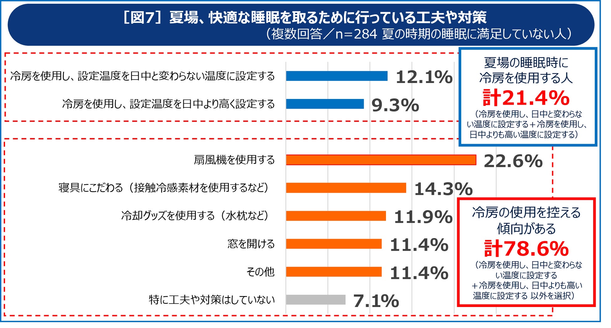 また、「満足できていない」と回答した人の、夏場に快適な睡眠をとるために行っている工夫や対策を見てみると、睡眠時に冷房を使用する人は約2割(21.4%)に留まり、約8割(78.6%)は冷房以外の方法で工夫・もしくは対策しておらず、冷房の使用を控える傾向にあることが伺えました[図7]。今年は例年よりも冷房の使用を控える人が増えるため睡眠の質がより低下するリスクがあり、さらに、冷房を切って眠る人が増えることで睡眠中に熱中症が発症する「睡眠熱中症」のリスクが高まることが推測され、注意が必要です。