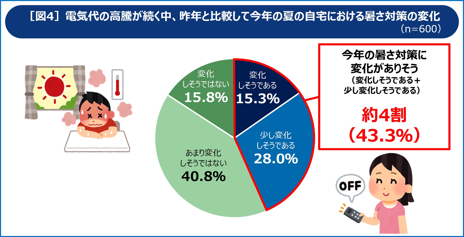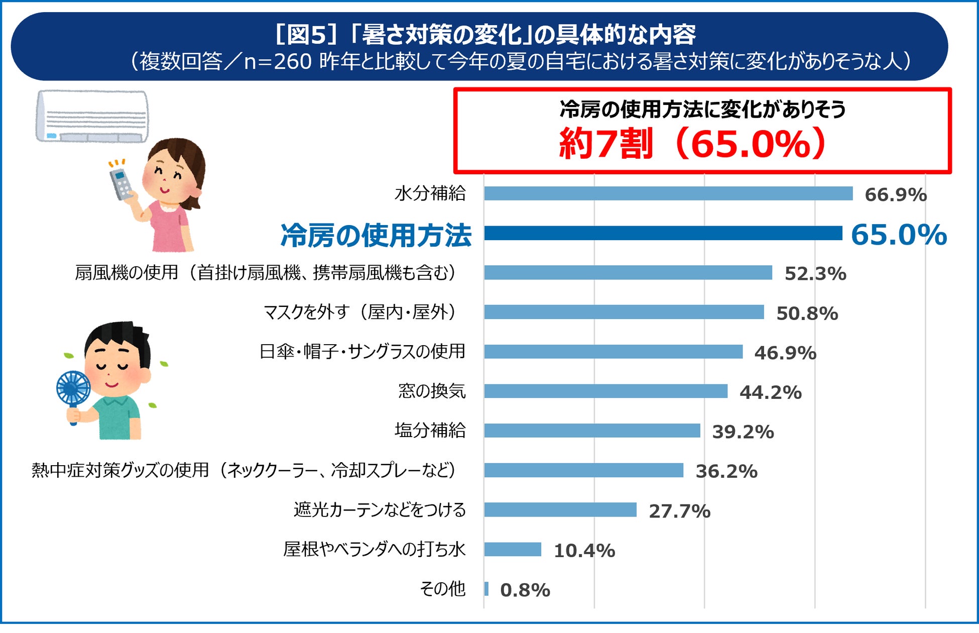 昨年と比較して今年の暑さ対策の変化の有無を聞いたところ、約4割(43.3%)が「変化がありそう」と回答しました[図4]。また、「変化がありそう」と回答した人に、具体的な内容を聞いたところ、「冷房の使用方法」と回答した人が約7割(65.0%)に上り[図5]、電気代の高騰を受けて冷房の使用を控える傾向が強まることが示唆されます。