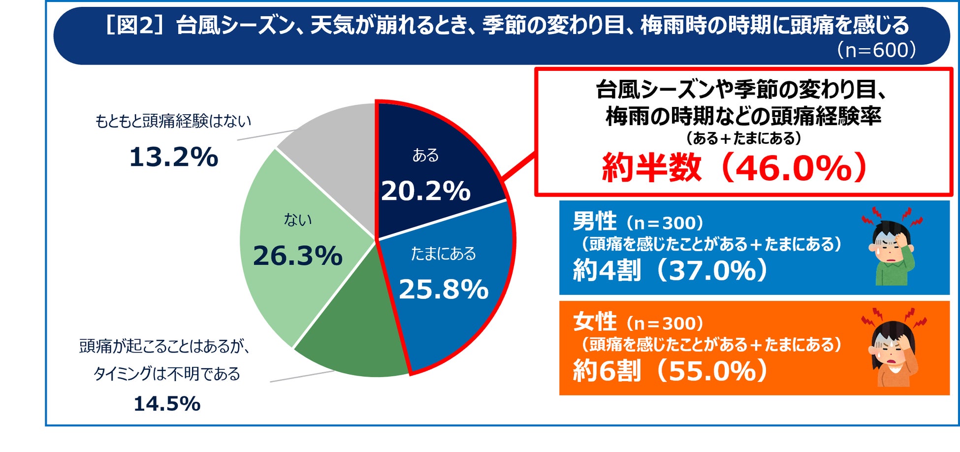 台風シーズンや季節の変わり目、梅雨の時期などに頭痛を感じたことがある人は約半数(46.0%)に上りました。男女別でみると男性は約4割(37.0%)、女性は約6割(55.0%)と、女性の方が頭痛を悩みとして抱えている人の割合が多いことが判明しました[図2]。