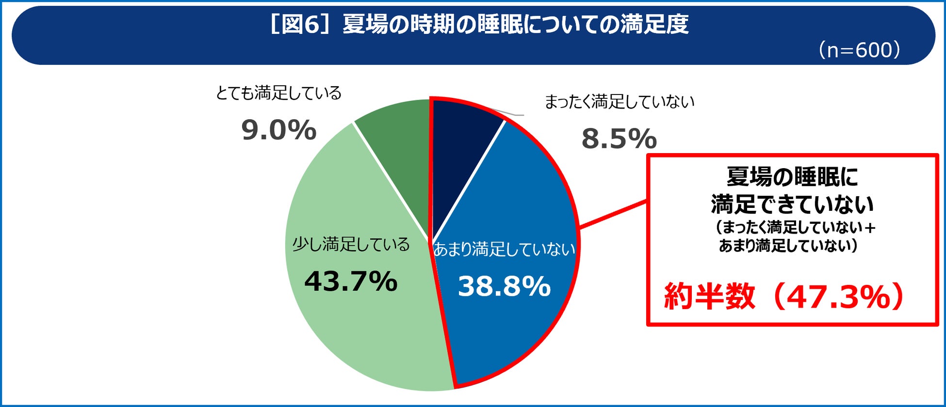 夏の睡眠の満足度を聞いたところ、約半数(47.3%)が「夏場の睡眠に満足できていない」と回答しました[図6]。