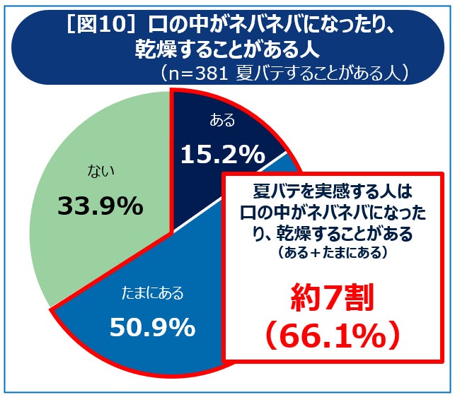 夏に気になる体調や症状について聞いたところ、約6割(63.5%)が「夏バテすることがある」と回答しました。さらに、夏バテ経験者の約7割(66.1%)が「口の中がネバネバになったり、乾燥することがある」ということが判明しました[図10]。