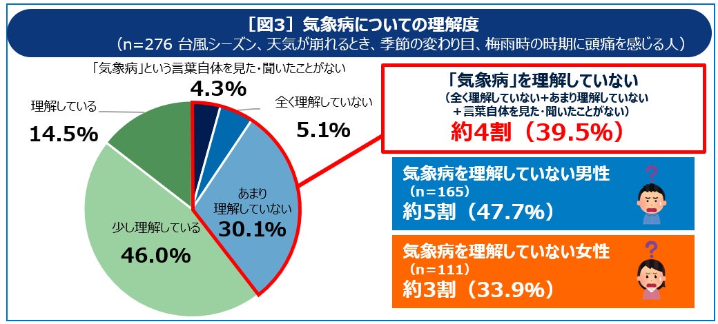 気象病について正しく理解できていると思うか聞いたところ、約4割(39.5%)が「理解していない」という結果になり、これらの人が季節の変わり目などに原因不明の不調がある場合には「隠れ気象病」の可能性があることが判明しました。男女別でみてみると、「気象病」を理解していない割合は、男性が約5割(47.7%)、女性は約3割(33.9%)と、男性の方が理解していない人が多い結果になりました[図3]。