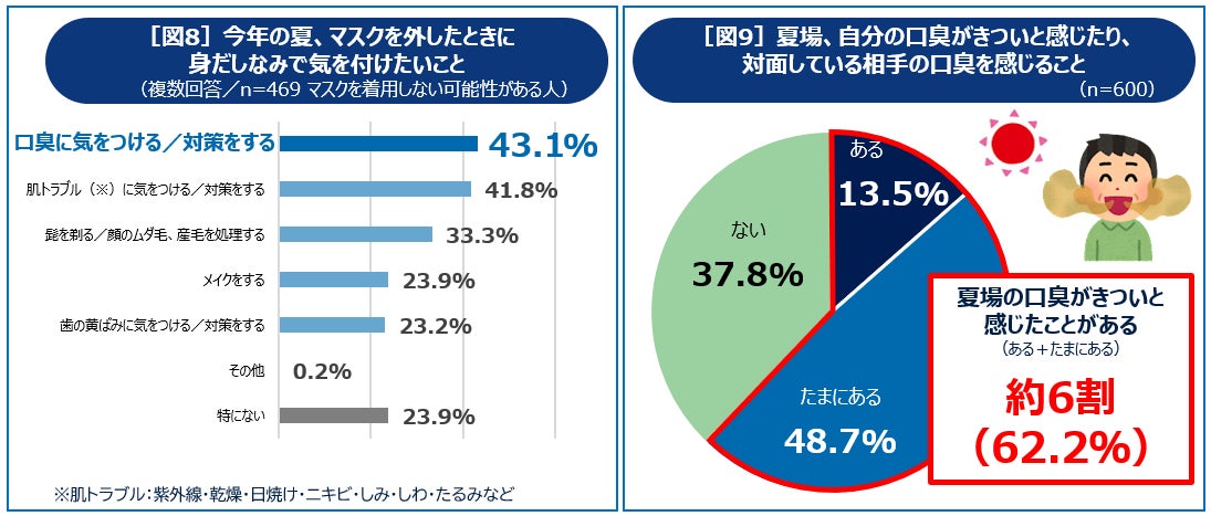 今年の夏、マスクを外した際に身だしなみで気を付けたいところを聞くと、約4割(43.1%)が「口臭に気を付ける/対策をする」と回答[図8]。さらに、夏場自分の口臭や対面している相手の口臭を感じたことの有無について聞いたところ、約6割(62.2%)が「夏場の口臭がきついと感じたことがある」ということが判明しました[図9]。