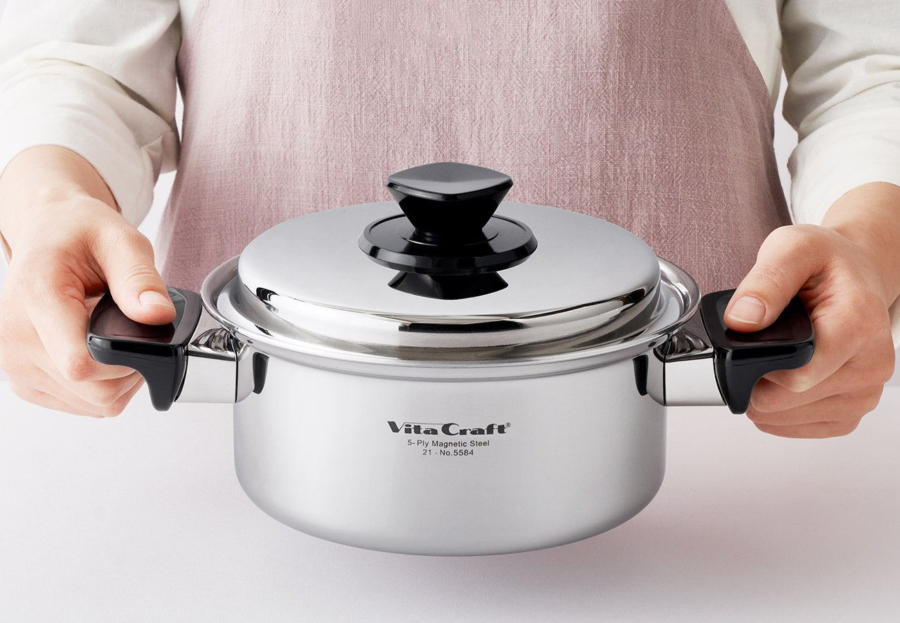 『家族の健康は、毎日の家庭料理で守っていく』という精神に基づき、1939年にアメリカのカンザスシティで生まれたビタクラフト。無水・無油調理を基本とする健康調理を提唱し、卓越した独自の技術力による全面多層構造鍋を開発しています。
