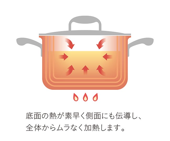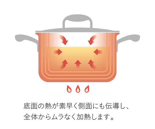 その優れた熱効率によって小さな火力でも均一に熱を伝えることができるので、短時間でおいしく料理が仕上がり、エネルギーの節約にもつながります。
