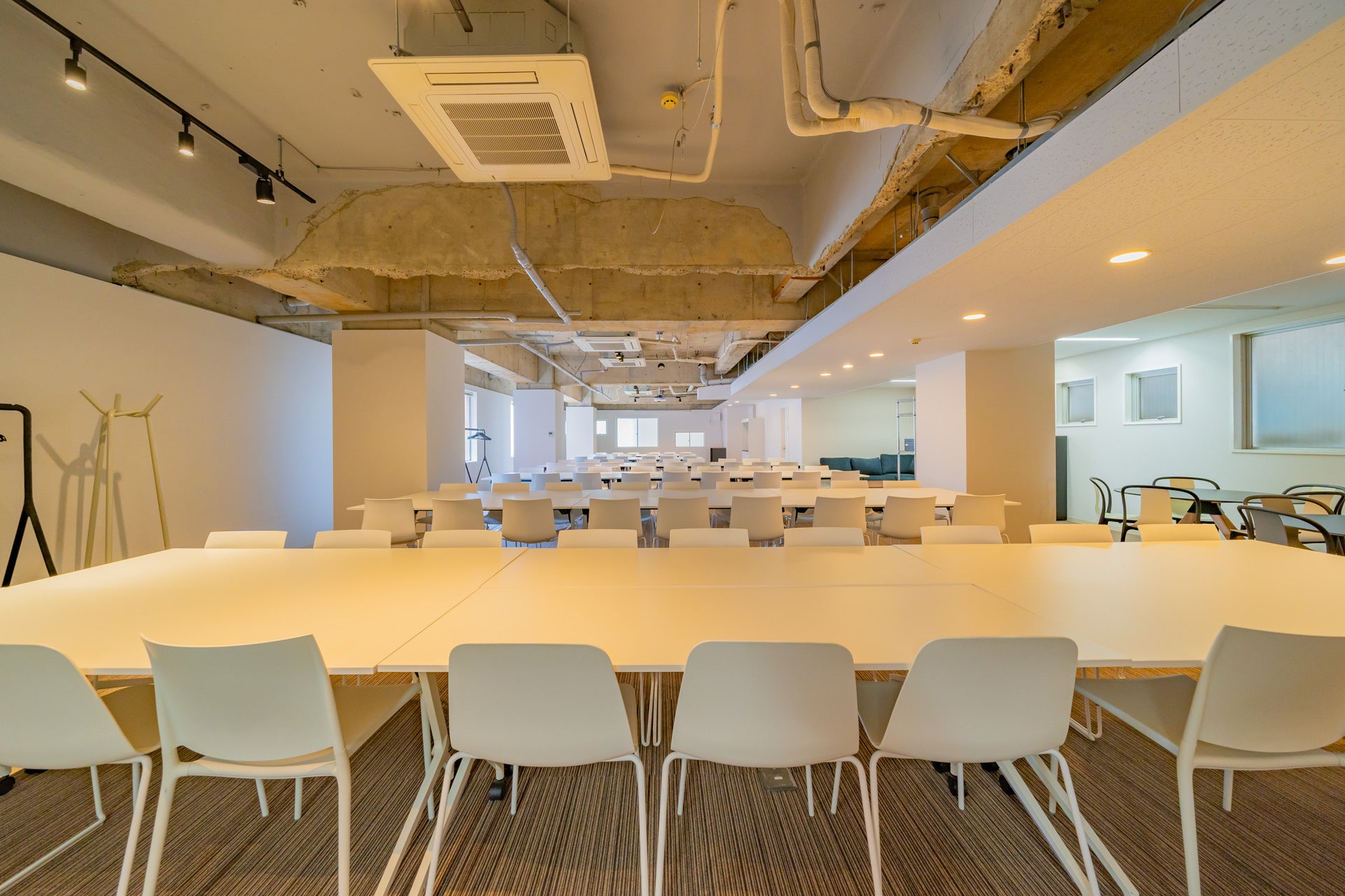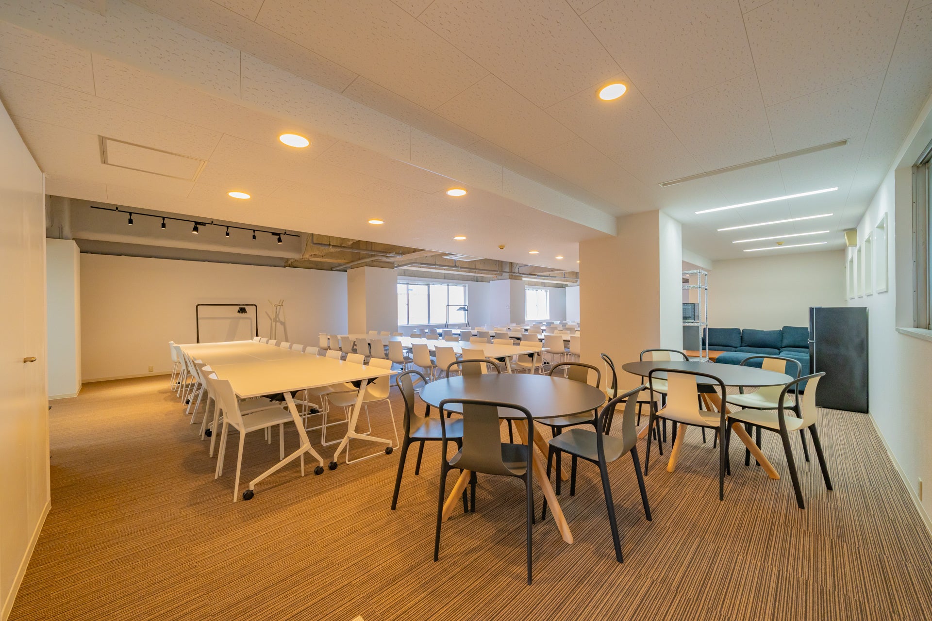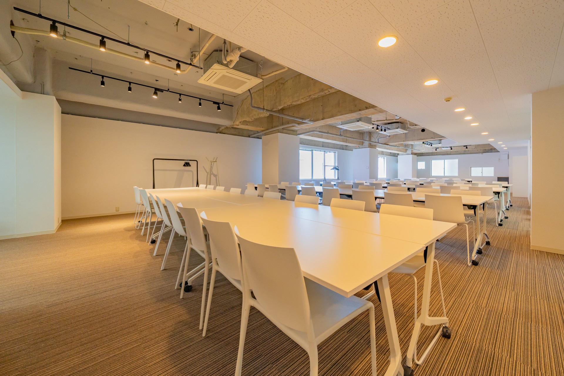 メインスペースは、白で統一したテーブルとデザイナーズチェア(Vitra社のTip TonやBelleville Chairなど)を100脚以上ご用意。最大150名程度利用可能です。18名用のセミナースペースは、テーブル付で可動性の高いErgohuman Skate Studieを採用しました。