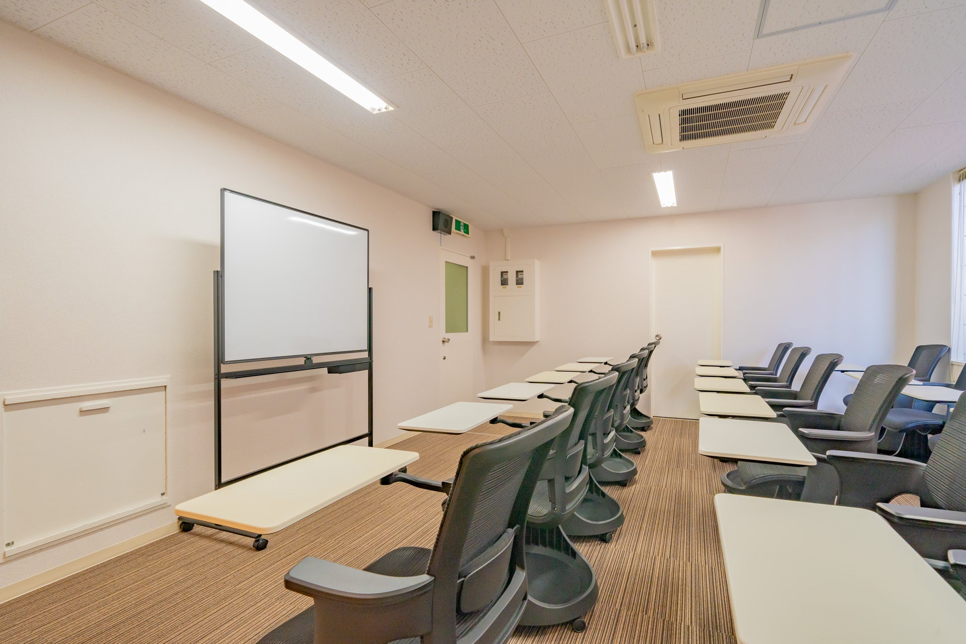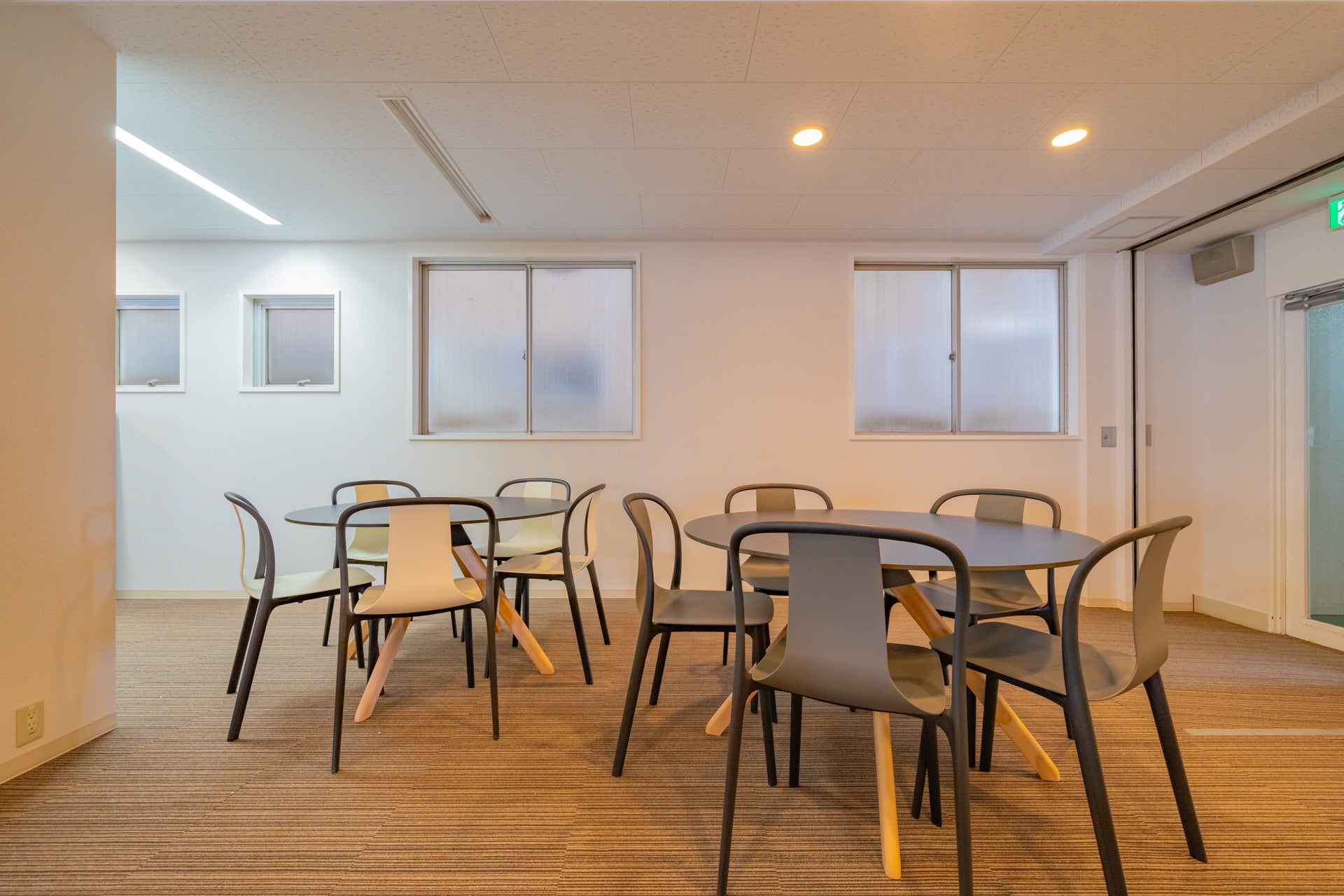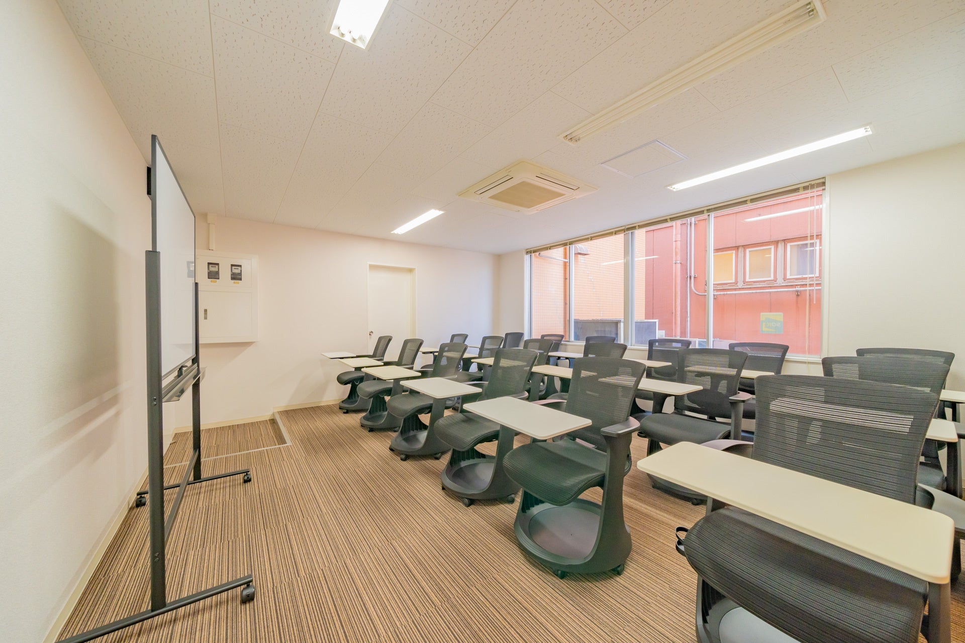 メインスペースは、白で統一したテーブルとデザイナーズチェア(Vitra社のTip TonやBelleville Chairなど)を100脚以上ご用意。最大150名程度利用可能です。18名用のセミナースペースは、テーブル付で可動性の高いErgohuman Skate Studieを採用しました。