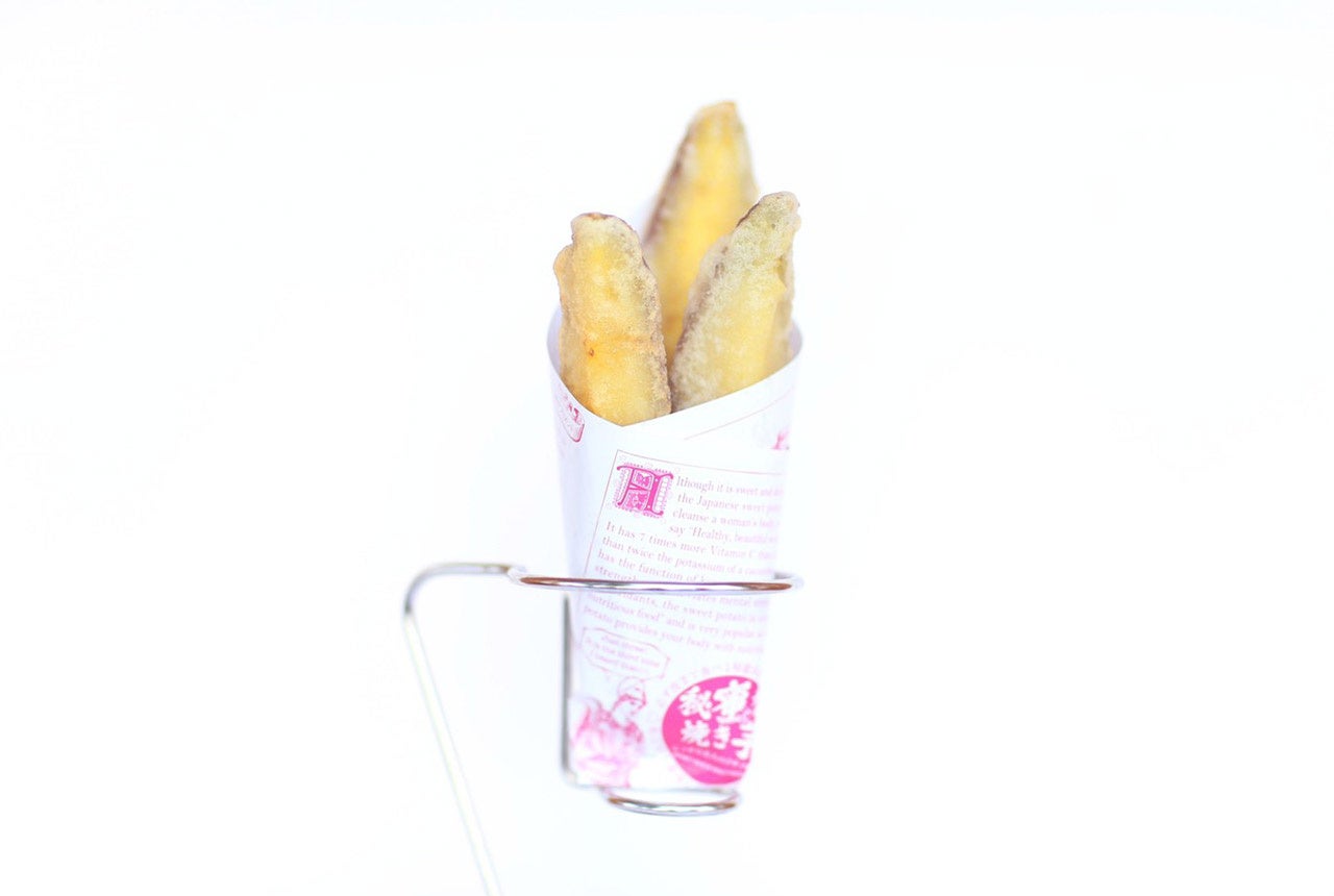 メディアでも多く取り上げられる表参道の焼き芋専門店「秘蜜な焼き芋」の焼き芋を、天ぷらにしました。糖度が高い熟成焼き芋と、特製塩の塩味とのバランスが良い新感覚な天ぷらです。独自の調理法によって「秘蜜な焼き芋」の特徴でもあるねっとりとした甘みがさらに際立っています。