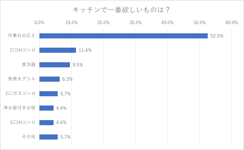 女性の方が自炊をする傾向が強いためか、作業台の広さがもっと欲しいという回答が群を抜いてます。逆に言うと、一番不満を持っているのが、キッチンの作業台が狭いということだと言えるでしょう。