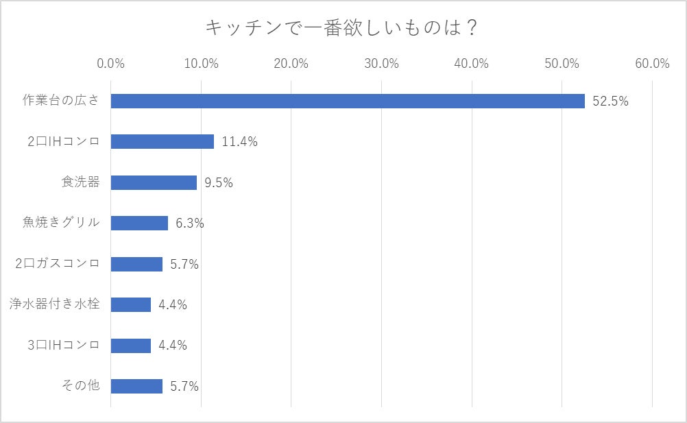 また、キッチンで一番欲しいものは圧倒的に「作業台の広さ」となり、料理が生活の重要なポジションを占めることもわかりました。