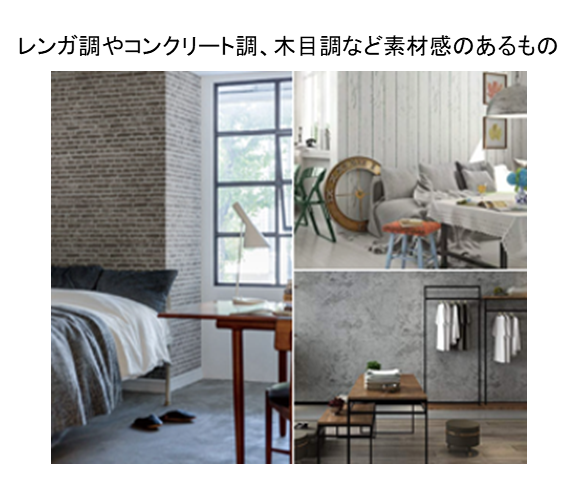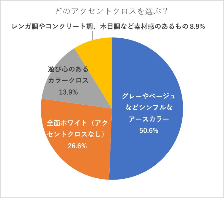 「グレーやベージュなどシンプルなアースカラー」が50.6%と一番多く、次いで「全面ホワイト(アクセントクロスなし)」が26.6%、「遊び心のあるカラークロス」が13.9%、「レンガ調やコンクリート調、木目調など素材感のあるもの」が8.9%という結果になりました。