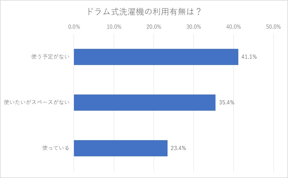 最近では、ドラム式洗濯機の需要が高まっているといったニュースも見かけますが、使用している人は2割程度とそれほど利用者が多いわけではないようです。2番目に回答が多かった「使いたいがスペースがない」が、その大きな理由のようです。