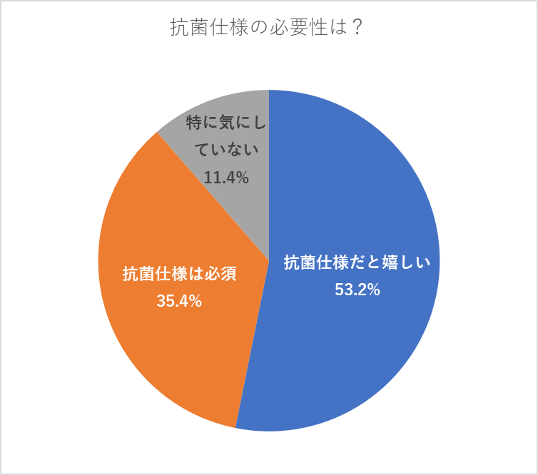 冬場のインフルエンザの流行やコロナ禍を経験したことで、昔に比べて、消毒や手洗いの意識が飛躍的に高まっています。ほぼ9割の方が抗菌仕様を望んでいることを見てもそれは明らかでしょう。