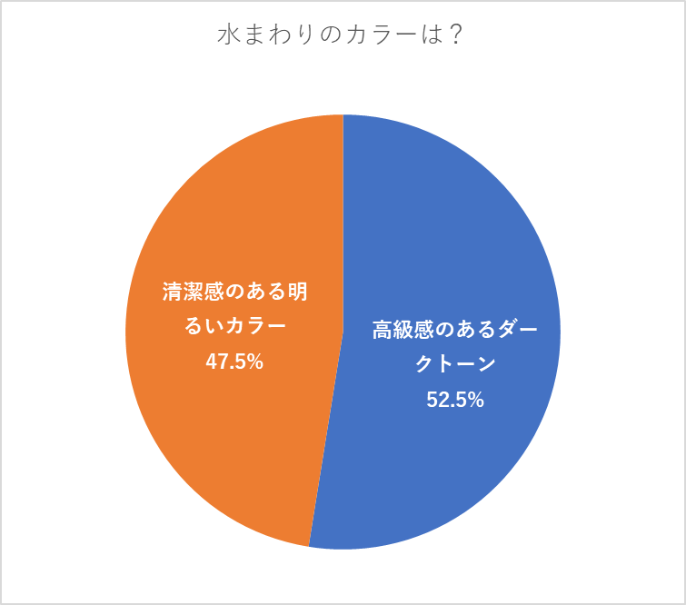 - 水まわりのカラーやライトの種類に関しては嗜好が半数ぐらいずつに分かれてくる。