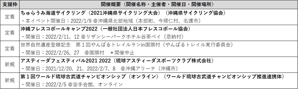 沖縄県は、令和4年度スポーツツーリズム戦略推進事業において、今年度の秋冬、県内で開催するスポーツイベントのモデル事業を公募し、開催を支援します。県内外の個人・法人・団体を対象に公募・審査をおこない、支援者には「新規事業支援枠:上限500万円」又は「定着化枠:上限300万円」、「付帯事業:上限100万」を補助します。 当事業は、スポーツの種目や規模を問わず全国から募集しますが、沖縄の自然や気候、歴史文化など当県での開催に優位性や関連性があり、補助後の持続の可能性等を審査いたします。