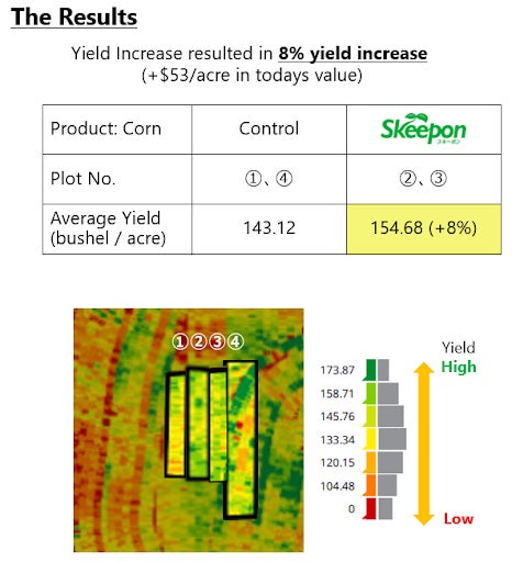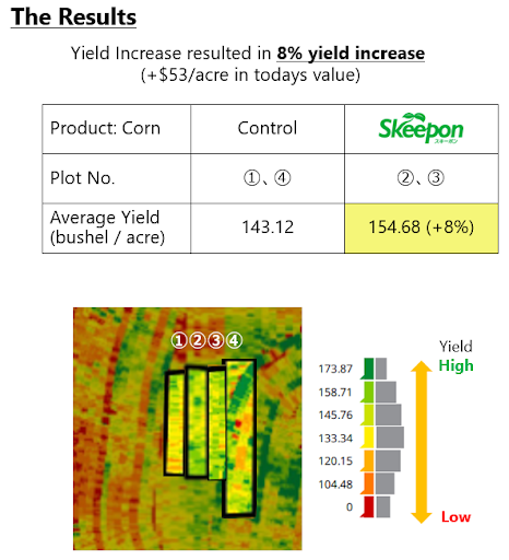 ネブラスカ州のコーン農家と協力し実施した試験では、スキーポンの散布区画が慣行区と比べ収量が8%向上しました=下図参照。スキーポンが熱・乾燥耐性に強い作物の生育に貢献できている可能性を示唆しています。