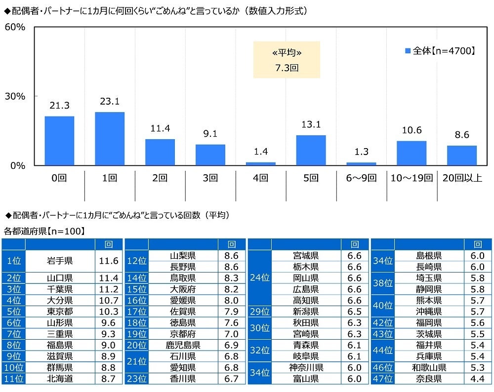 配偶者・パートナーに“ごめんね”と言っている回数 平均は7.3回/月、1位は岩手県で11.6回/月